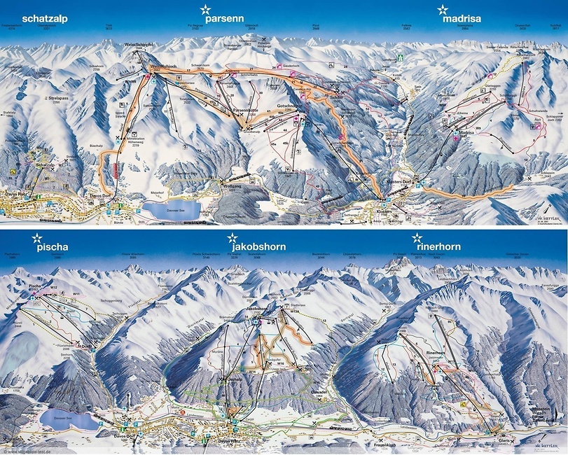 Spośród wielu terenów narciarskich w okolicach samego Davos, zapalonym narciarzom najbardziej do gustu przypadają trasy na Parsenn/Gotschna, gdyż oprócz pięknego krajobrazu można tam sprawdzić w praktyce swoje umiejętności. Swoistą rolę węzła komunikacyjnego pełni szczyt Weissfluhgpfel, który wznosi się na wysokość przekraczającą 2800 m.n.p.m. Do pozostałych terenów narciarskich należy Pischa, Rinderhorn, Jakobshorn i Shatzapl/Strela. Znajdująca się w dolinie Flüela Pischa i Rinerhorn głównie oferują trasy dla początkujących i średnio zaawansowanych, do których można dotrzeć samochodem bądź bezpłatnym skibusem.